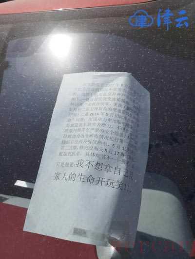 4日,津云记者来到了长江道的中海汇4S店。在店门口,另一辆众泰E200轿车堵在店门口,车内没有司机,在车窗上贴着一张说明,大致内容为:这辆车购买于2017年8月,使用近一年来,车辆出现钥匙不灵,首保时变速箱漏油,动力电池断电等情况。今年5月12日,车主对断电情况进行了维修,可修好没两天再次断电,5月15日第二次维修,17日第三次断电。