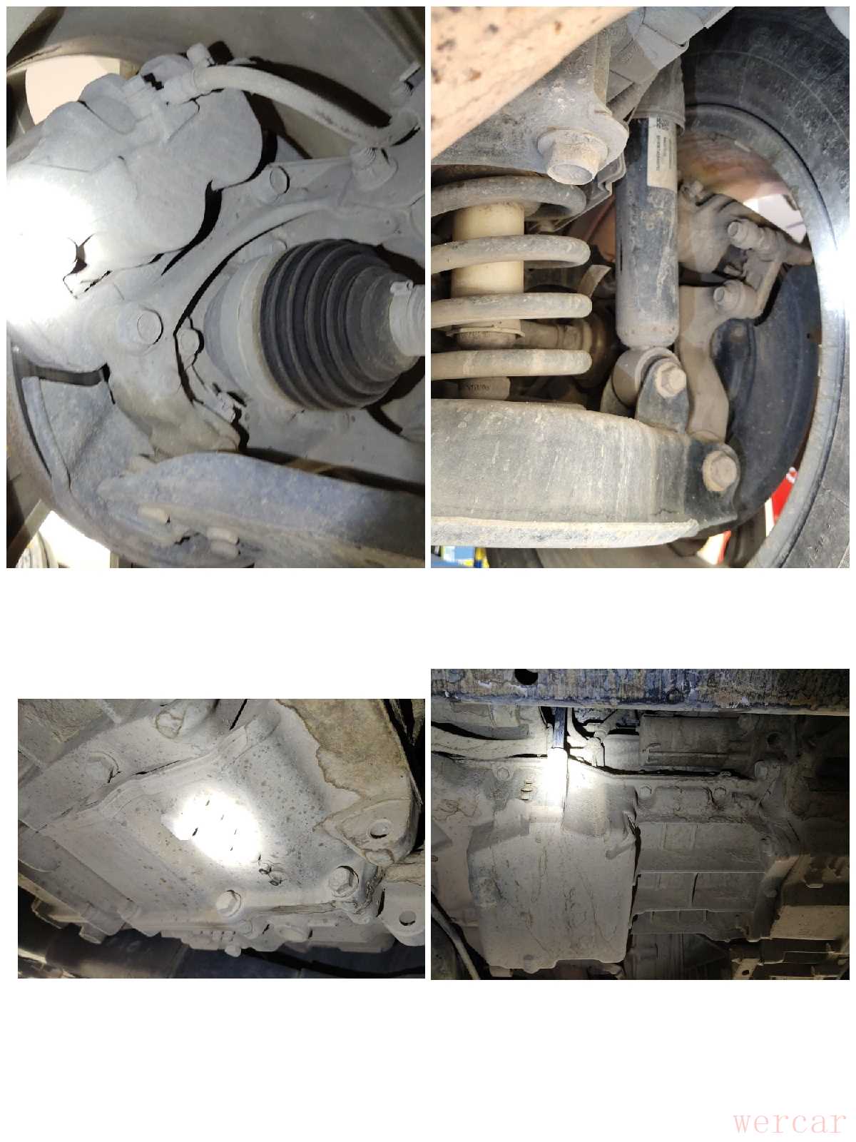 举起底盘,四个悬挂没有任何损坏拆装痕迹,胶套也没有破损漏油,发动机和变速箱下部没有一丁点渗油,底盘机械部分可以给到满分!