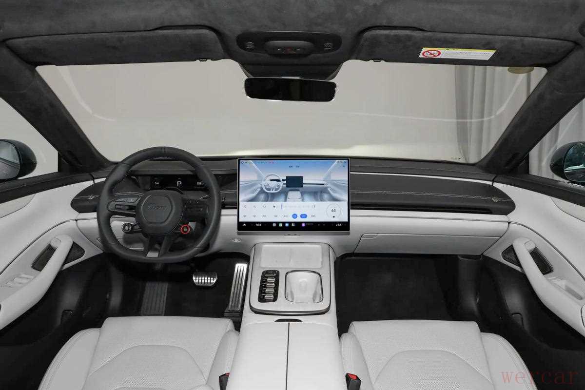 简约的内饰采用双色设计,嵌入贯穿式空调出风口,搭载运动风的平底方向盘,前方还有液晶仪表,中央通道上搭载有换挡机构。悬浮式的中控大屏搭载高通骁龙8295座舱芯片,支持可见即可说功能。