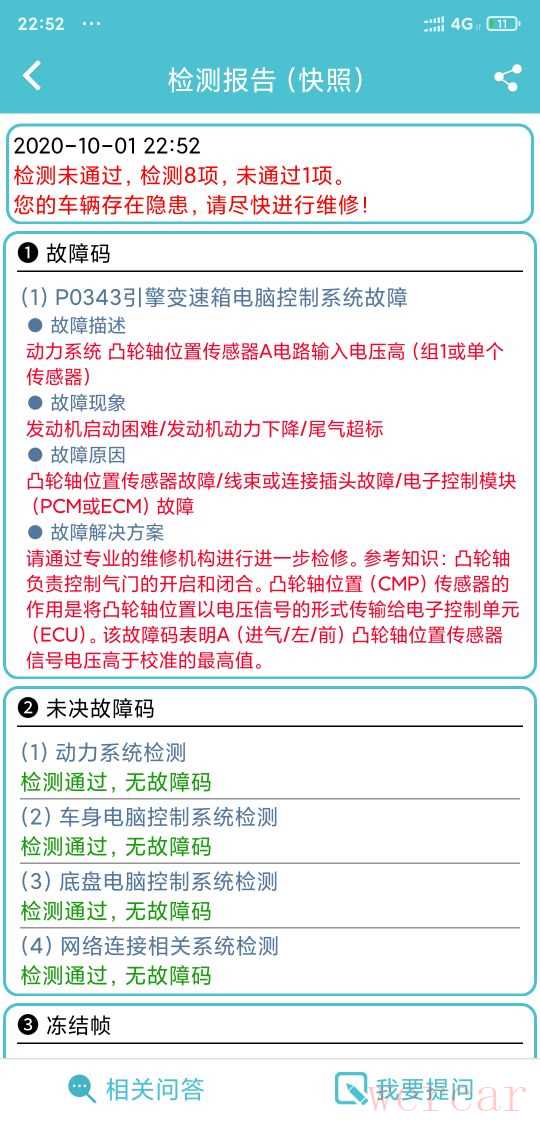 连接自己买的小OBD设备,查看具体故障码,错误码显示:凸轮轴位置传感器高电压!如图: