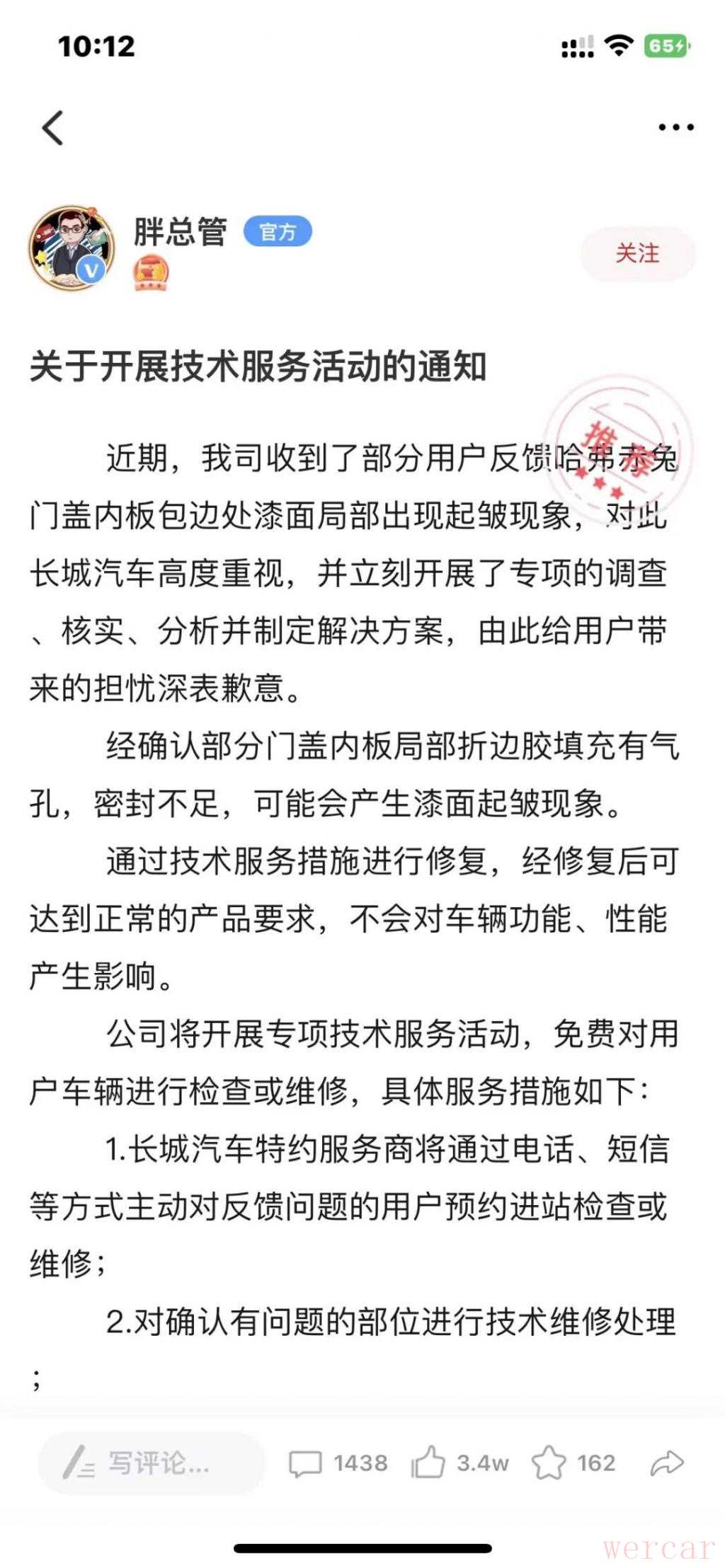 事实上,关于车漆褶皱问题,哈弗方面曾经给出过解决方案,在哈弗智家 APP 发布《关于开展技术服务活动的通知》。该《通知》大概可以分为两部分:1、哈弗赤兔车型出现的爆漆现象,经确定部分门盖内板局面折边胶填充有气孔,密封不足,可能会产生漆面起皱现象;2、哈弗将通过技术服务措施进行修复,经修复后可以达到正常的产品要求,不会对车辆功能、性能产生影响,并对维修后的区域漆面给予终身质保。