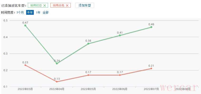 销量上,哈弗初恋的销量更高,但实际上初恋的8月份销量只占到哈弗品牌的7.72%左右;赤兔就更加小了,只有2.43%,而更多的销量来自于老大哥哈弗H6。