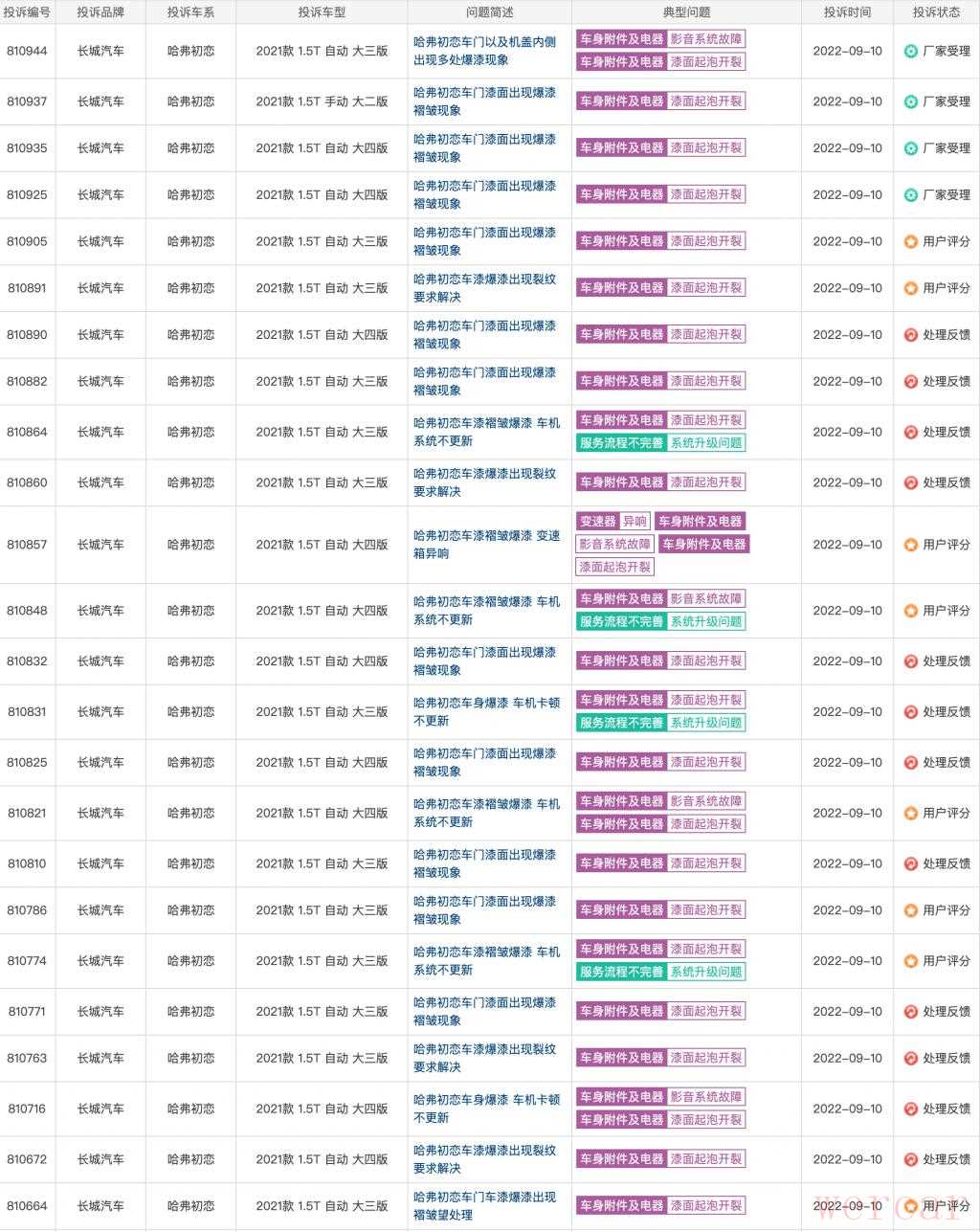 据车质网最新数据显示,截至 9 月 11 日,哈弗初恋车型的投诉量高达 198 宗,主要投诉问题为“漆面起泡开裂”,已经超越了哈弗F7等车型,暂时成为了投诉量第一的车型。而在投诉排行中,还有哈弗赤兔车型有相似的问题。
