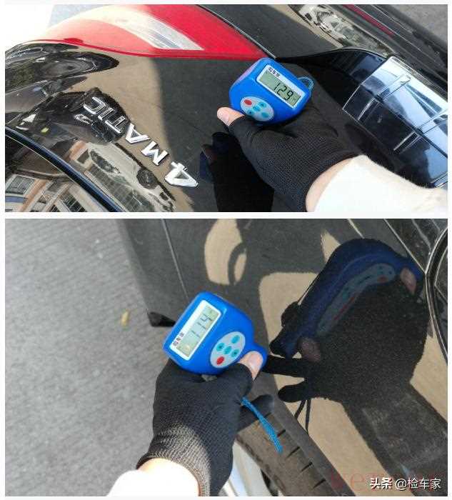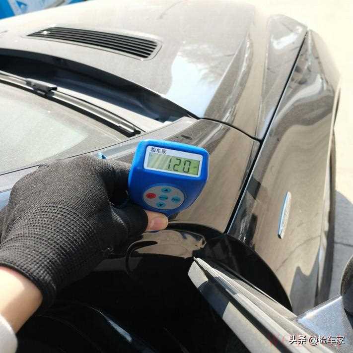 估摸着是我摸出刻度尺的时候,买卖双方都意识到了情况不妙就很自然地凑了过来,由于是悄无声息的靠近,再加上我太专注了就没发现。等魂魄归位后,三杠我现场跟两位大哥讲了一下,目前看来这个数值不高且面积不大,结合更换右前门和右前翼子板,应该是擦挂引起的,事故中右前门铰链位置受力有轻微内陷,修复过程中拉出来造成A柱有腻子修复。