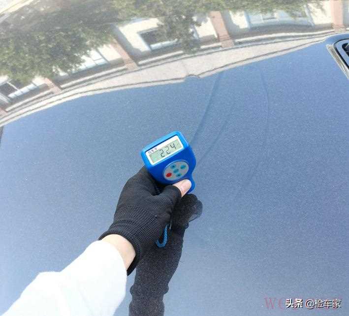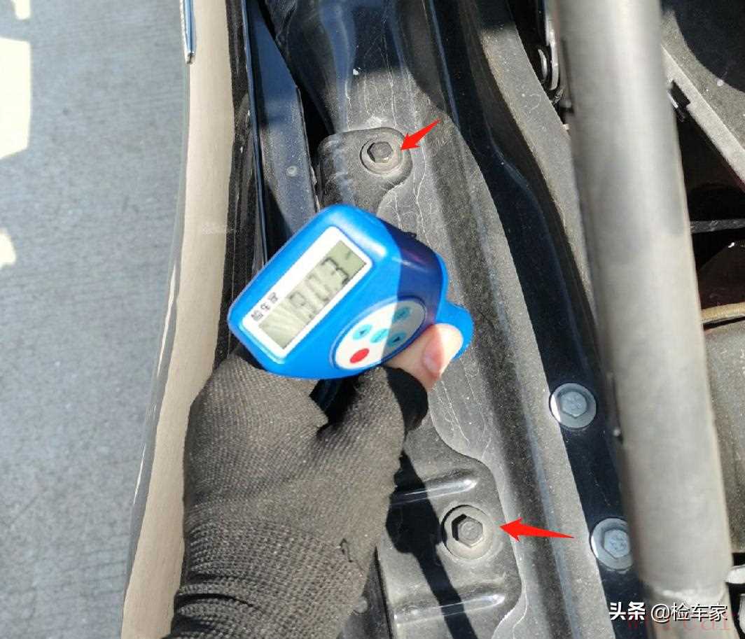 给机盖打一下数值,明显偏高了,但喷漆的效果还是不错,再看机盖内侧,车架号贴纸、胶体以及边缘做工均为原厂工艺,没有更换情况。