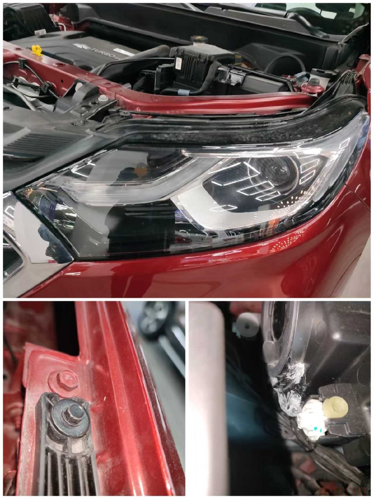 左边大灯的固定螺丝拆过,后灯壳破口了,现在是用胶水粘着的!