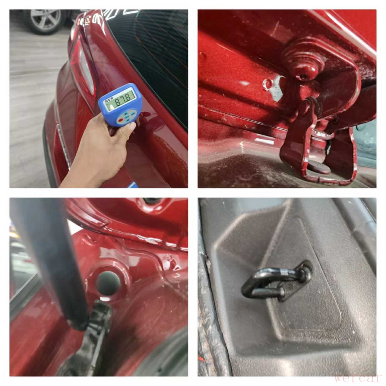 来到车屁股后面,后尾门和后保险杠同样保持了原厂漆,固定螺丝也是没动过的,后尾门门框边缘和两边导水槽的打胶也正常,焊点均匀自然,再看后备箱底板无变形无损伤,这样就排除后面的追尾事故了!