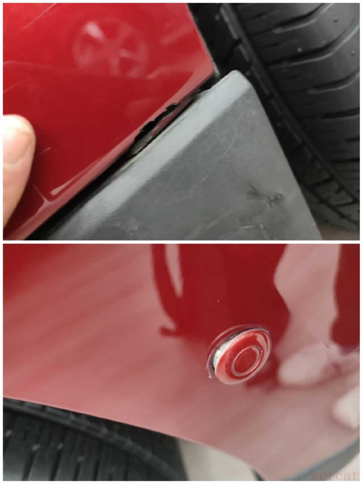 第一步还是检测车身外观。车头前保险杠有过喷漆,看雷达的边缘就知道了,而且雷达都快要掉下来了!前杠固定螺丝也有拆装拧动痕迹,综合判断前杠更换过配件。