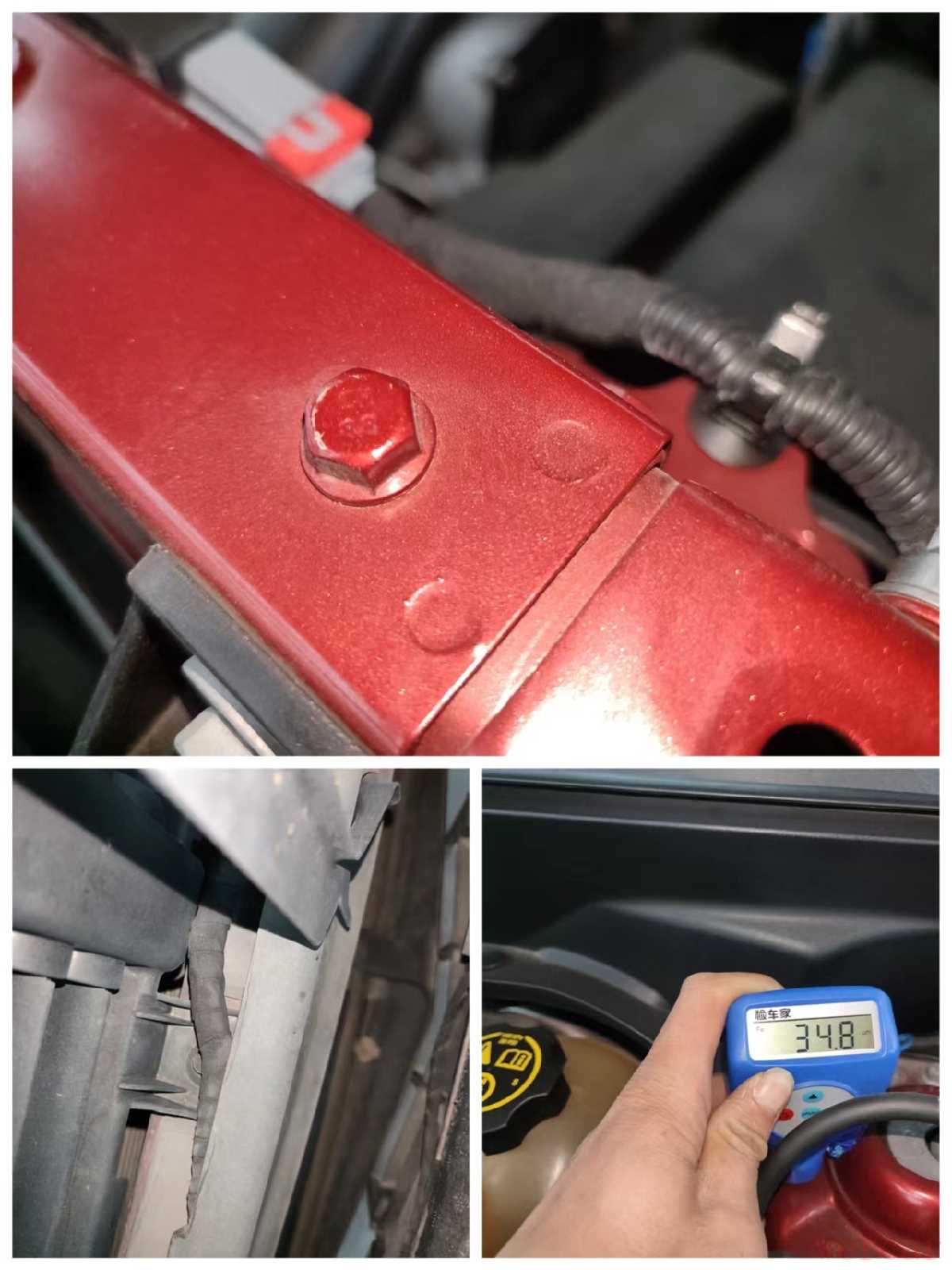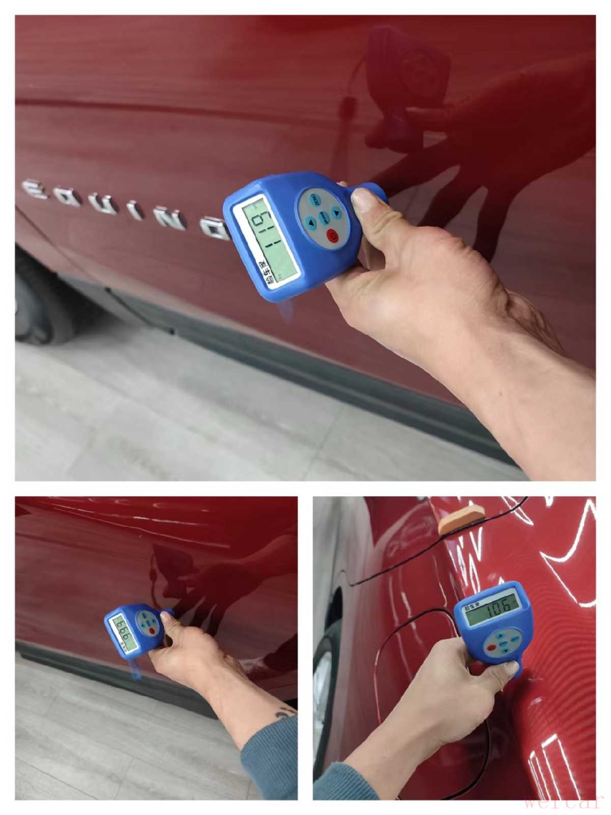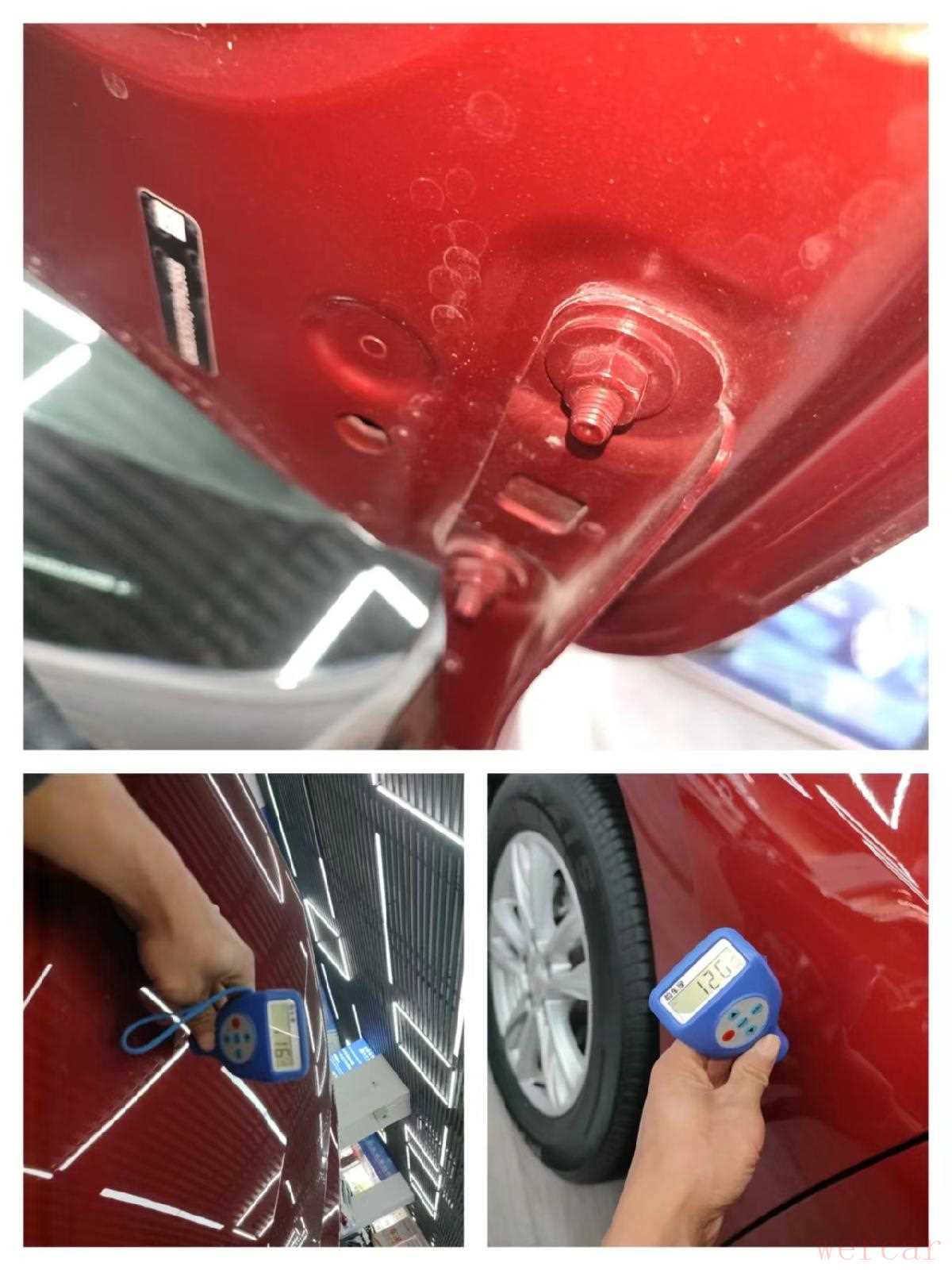 拿出漆膜仪,从车顶和A柱位置分别取一个漆膜基数,对比原厂的厚度标准应该是100μm左右,那么参考这个标准来检测其它金属面!先测了前机盖和左前叶子板,漆面厚度在正常范围,这两个部件的固定螺丝也没有动过,确认为原厂件。