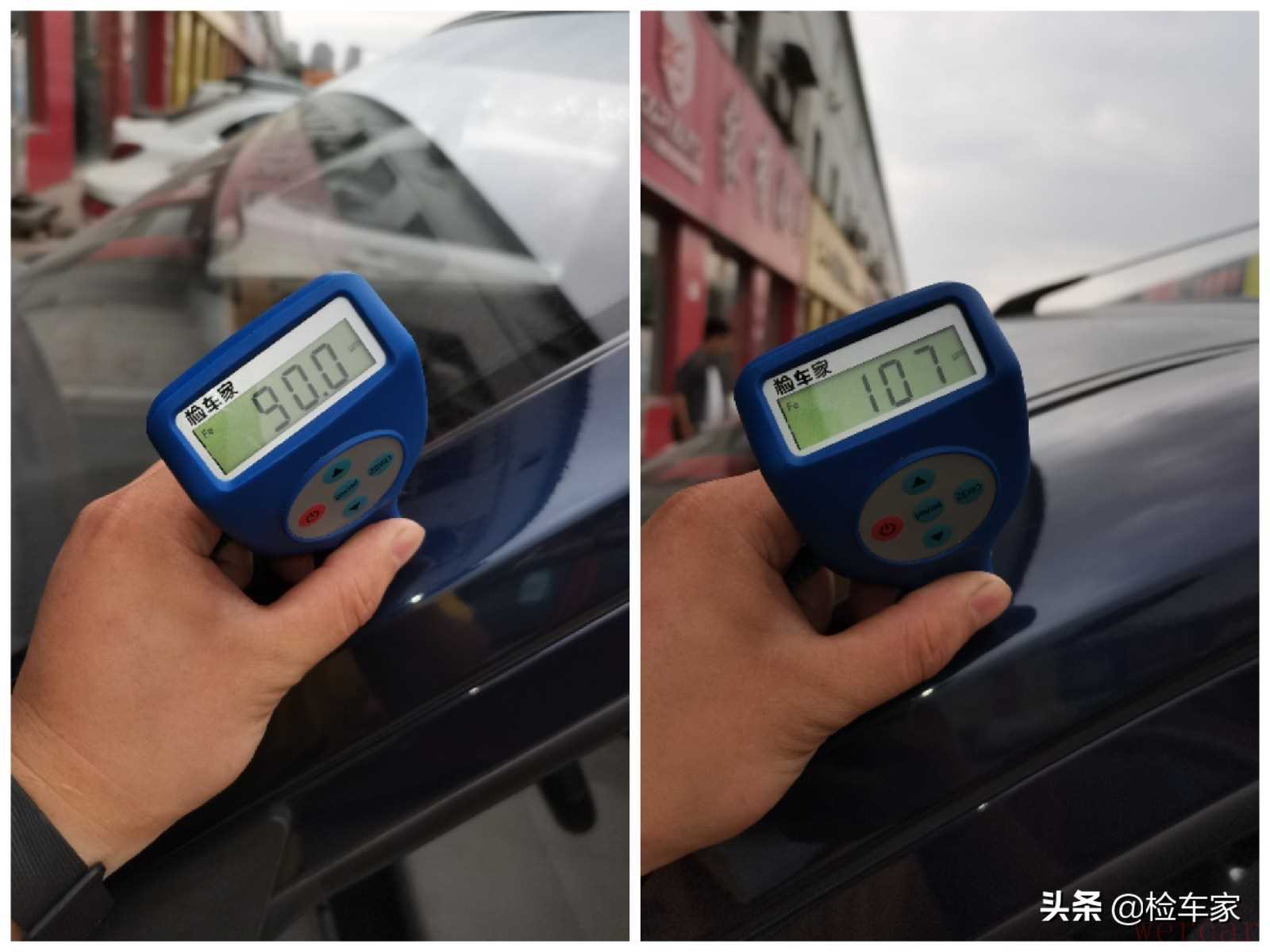 拿出漆膜仪上车顶,肉眼观察没有色差、褶皱和砂眼等喷漆痕迹,几个点位都是100μm左右的原厂数据,那么我们就可以用这个标准作为参考。
