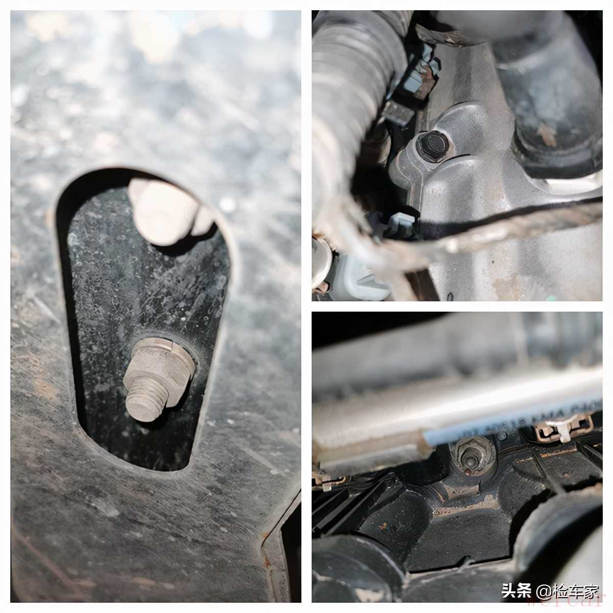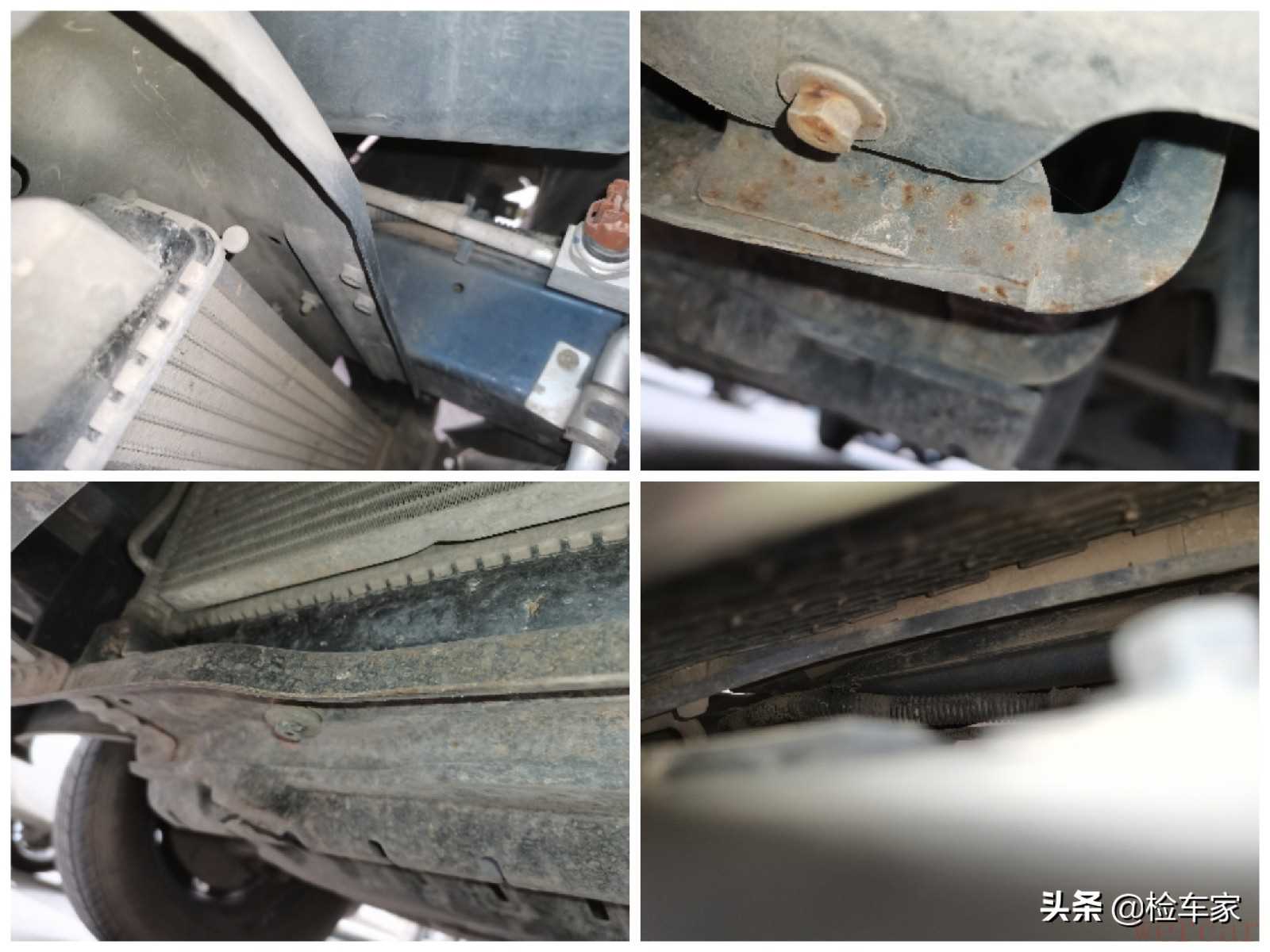 前面的水箱框架固定螺丝原封未动,框架下侧有一处细微的变形,估计是什么东西磕到了,问题不大,不影响正常使用。左右两侧叶子板骨架没有变形褶皱,纵梁梁头也是一切正常,表面没有钣金修复、裂痕、火烧和烧焊的痕迹。综合以上,再结合之前的漆面检测,我们排除了车头前面重大事故的嫌疑!