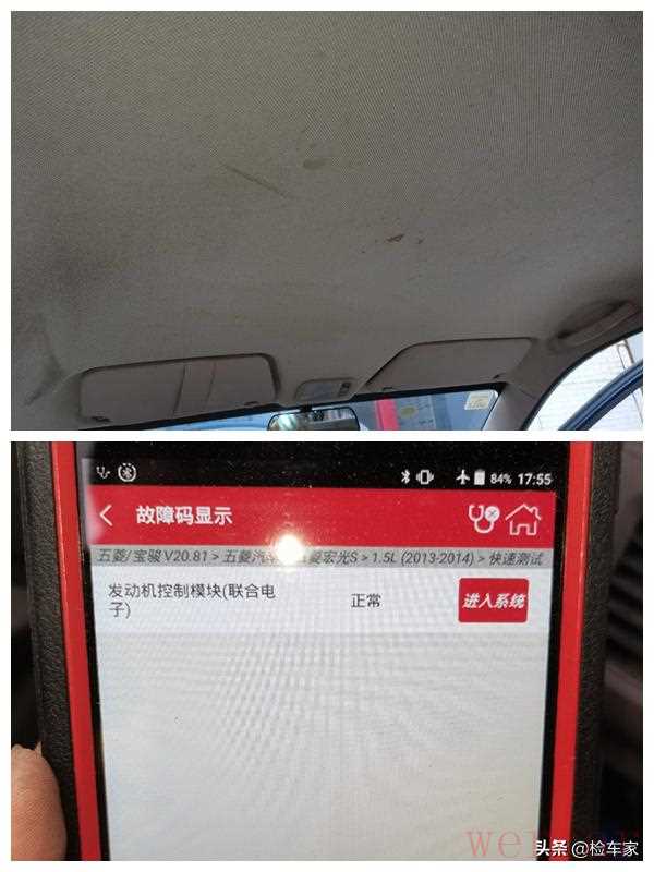 进入内饰,中控几乎没什么设计语言,车里面大体收拾过,不过顶棚上面的污渍没清理掉。启动车辆,仪表自检各系统指示灯显示正常,发动机怠速平稳无抖动,OBD电脑检测无任何故障码。