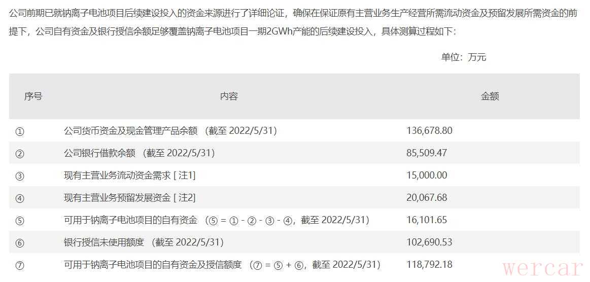 7月8日,传艺科技表示,目前公司货币资金及现金管理产品余额为13.67亿元,银行授信未使用额度10.27亿元,除去现有主营业务流动资金及预留发展资金,可用于钠离子电池项目的自有资金及授信额度达到11.88亿元。另外,公司表示,正积极与银行进行商谈,后续将通过进一步获取授信额度的方式以满足钠离子电池项目投产后的流动资金需求。