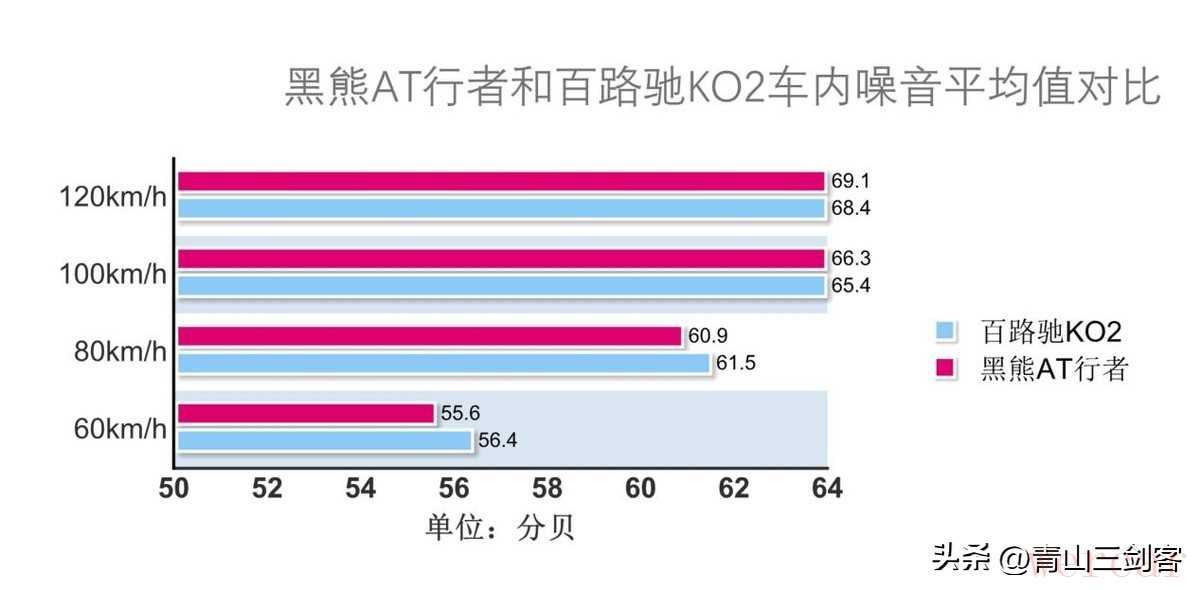 实测车速60km/h时,百路驰KO2噪音为56.4分贝,黑熊AT2行者则为55.6分贝;80km/h时,百路驰KO2噪音为61.5分贝,黑熊AT2行者为60.9分贝;100km/h时,百路驰KO2噪音为65.4分贝,黑熊AT2行者为66.3分贝;120km/h时,百路驰KO2噪音为68.4分贝,黑熊AT2行者为69.1分贝。