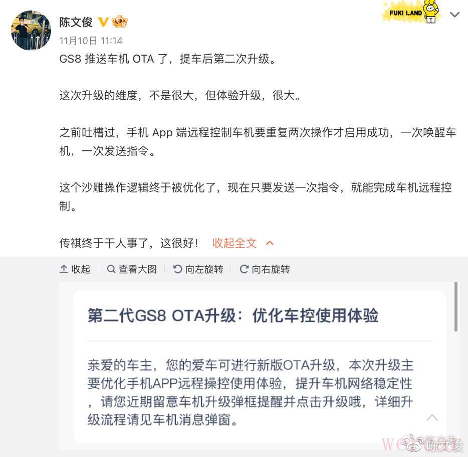 传祺对 GS8 的车机更新得挺频,提车不到半年收到了两次 OTA,不过严格来说,我认为只有 1.5 次更新,毕竟第一次除了增加一些缝缝补补的功能外,车机卡顿、Bug 的问题都没有得到根本性解决。