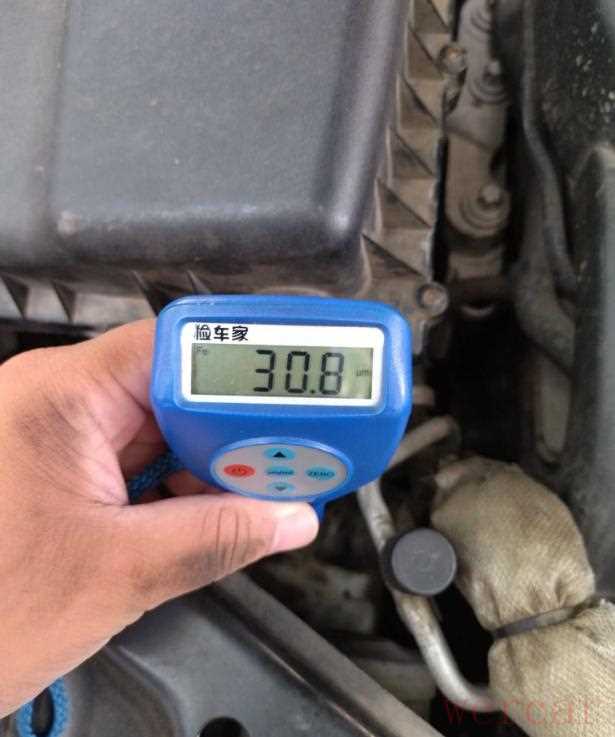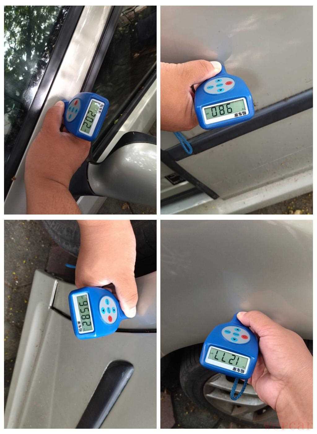 事不宜迟,首先测试一下车身漆面的情况。走完第一圈,发现漆面色差还是比较明显的,再摸出漆膜仪细心检测,发现全车除左前车门,基本上全车都有不同程度的钣金喷漆。