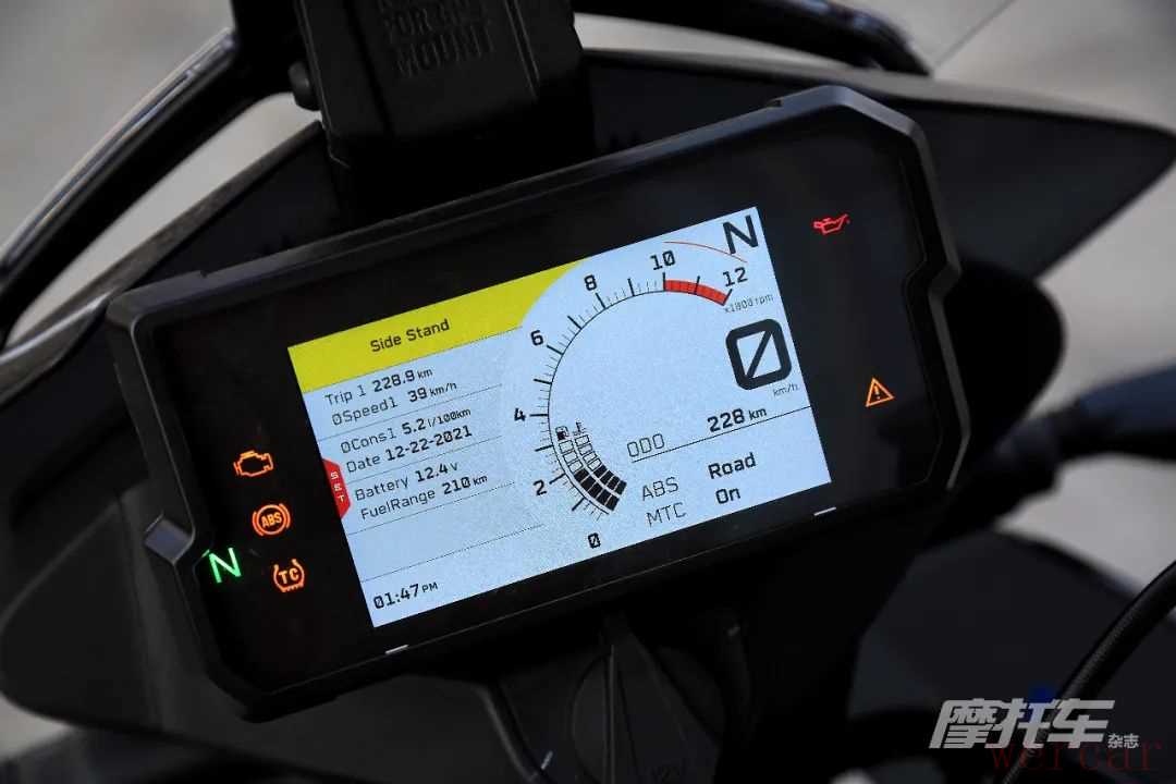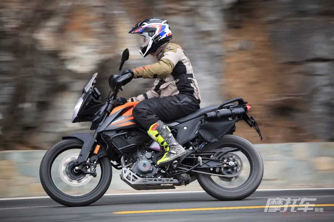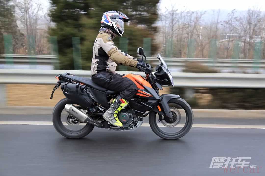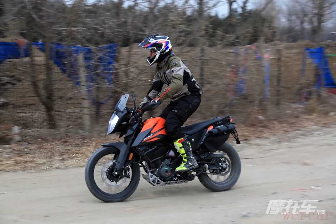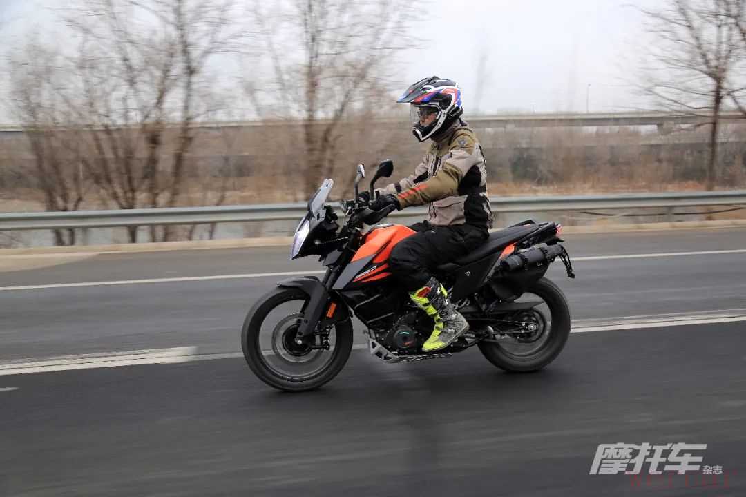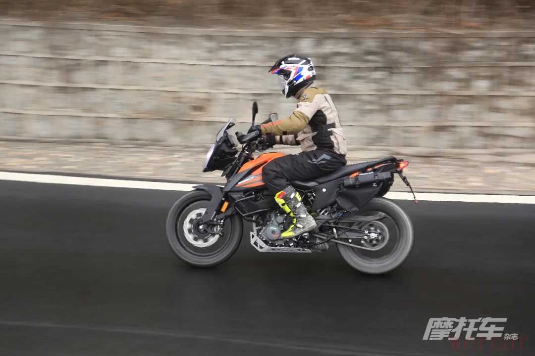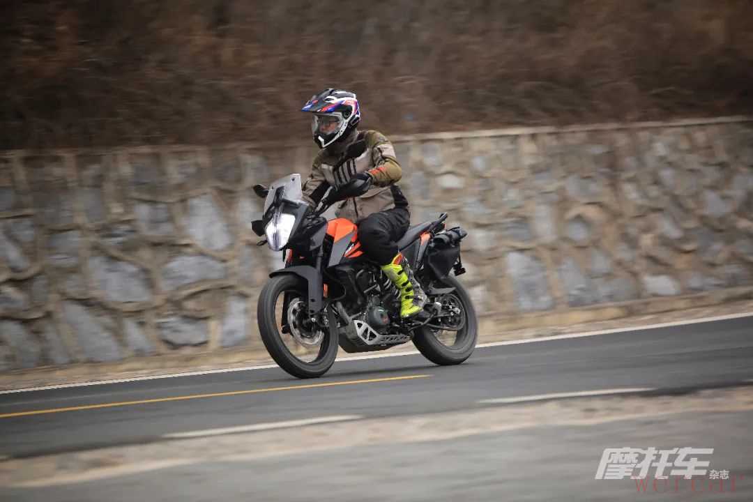 在加速测试中,390 ADV 0-100km/h加速成绩5.4秒,与390 DUKE有少许差距,但考虑到车重、全地形轮胎以及冬季抓地力等影响,也合乎情理。但这并不影响390 ADV的加速感受,这台短行程的发动机转速越高加速越猛的特性足够让你感到激情澎湃,5000r/min之后开始明显感觉到发力,这种感觉会一直延续到8000r/min以后,有不错的动力延展性。