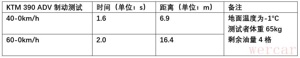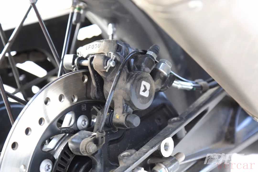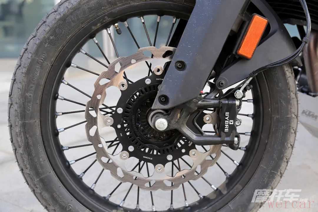 390 ADV前轮上装备了320mm的Bybre对向四活塞辐射式卡钳,后制动为230mm单活塞卡钳,并配有BOSCH 9.1双通道ABS,支持弯道ABS功能,并提供了可关闭后轮ABS的越野ABS选项。前轮规格100/90-19,后轮规格130/80-17。这套制动系统有效保证了390 ADV的制动效能,制动有力且线性,60-0km/h制动测试中制动距离16.4m,也是很不错的表现。可关闭的后轮ABS则极大提高了390 ADV在非铺装路况下的可玩性和制动有效性。