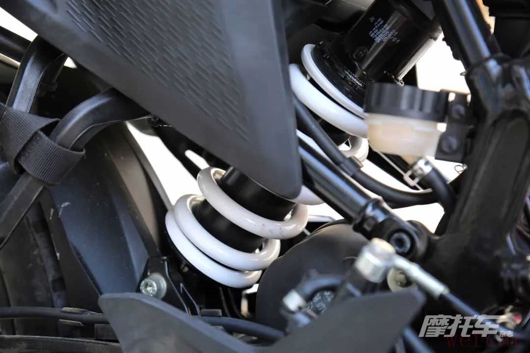 车架采用传统的钢管编制车架,副车架、后摇臂等关键部件也沿袭了家族血统。减震系统采用WP品牌,APEX 43mm全可调倒立式前叉(减震行程170mm),以及APEX中置后减震(减震行程177mm),支持预载和回弹可调。坐高也来到标准的855mm,不过车辆158kg的干重,驾驭这台小猛兽的压力并不大。