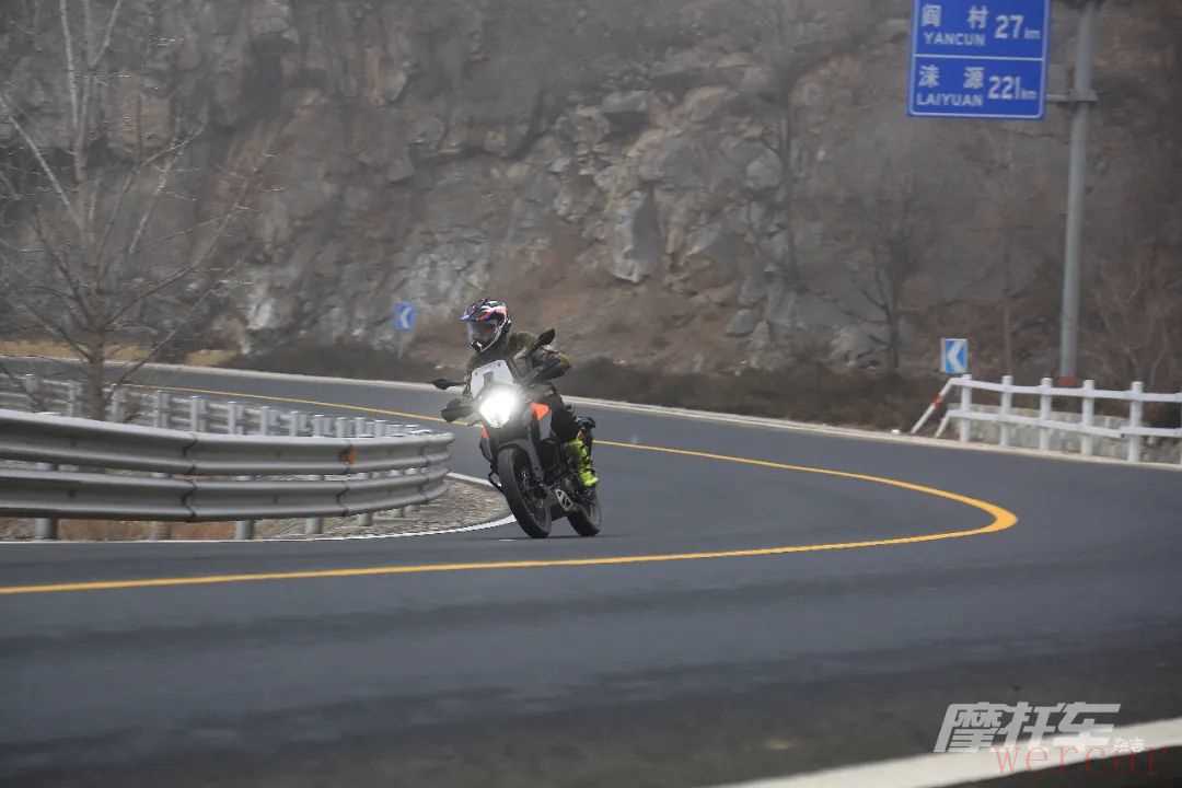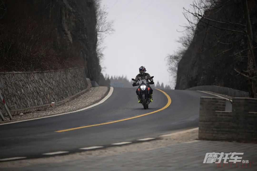 390 ADV在山路中的表现并不弱,较为轻巧紧凑的车身无论是快速翻身还是掉头时都有轻松的操控感,可调节的前后减震调至偏硬,稳定的循迹性让这款车带着你自如地驶过弯道。在当天下着小雪的山路上,标配的MTC牵引力控制系统也为行驶安全提供更多的保障。