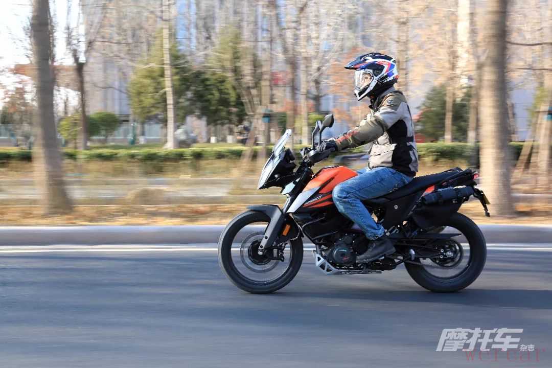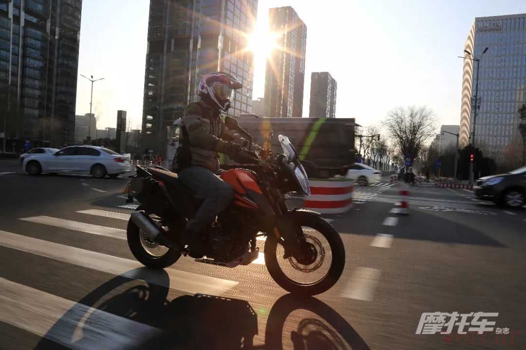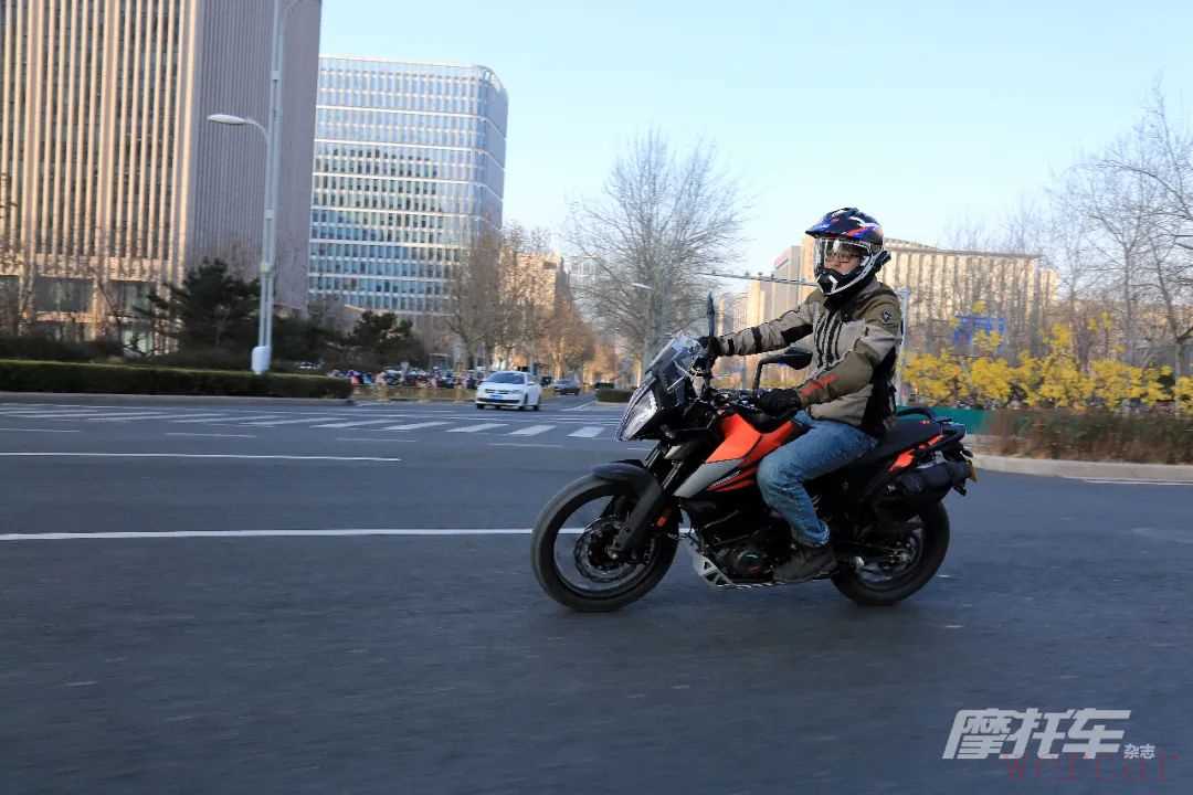 390 ADV的定位和设计都很契合多用途的定位,在拥挤的城市道路中,390 ADV有着不输小排量街车的灵活性,灵敏的油门反应、轻巧易控的车身、稳定可靠的制动,都让这台车在穿梭时游刃有余,配合比DUKE舒展不少的驾姿,感觉颇为轻松。不过北京拥堵的城市交通状况还是暴露出了390 ADV低扭弱的不足,当然这是源于这台发动机本身的特性,一挡怠速也会拖挡的表现在遇到堵车等慢速骑行情况下不得不更多的使用半离合干预。