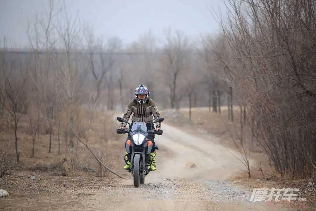 非铺装环境下,这台390 ADV就更好玩了,调节减震,关闭牵引力控制系统和后轮ABS,便进入了玩土模式。在砂石路面的细碎颠簸中,悬挂的表现够用,韧劲很足,很得体。遇起伏较大的坑洼,前悬挂的行程还够用,后悬挂因为没有采用多连杆,反馈有点生硬。另外低扭偏弱的弱点在非铺装骑行时也不得不较为频繁的换挡,以保持在较高的转速。