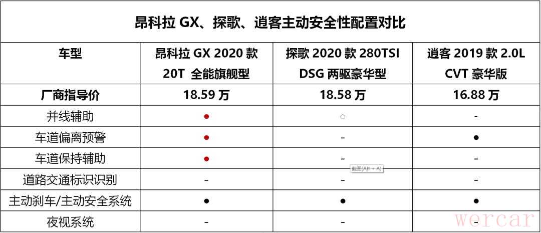 同价位的探歌,仅标配了主动刹车系统,并线辅助功能需要选配。就实用性来说,这样的主动安全辅助系统已经无法很好地满足当下消费者的需求。
