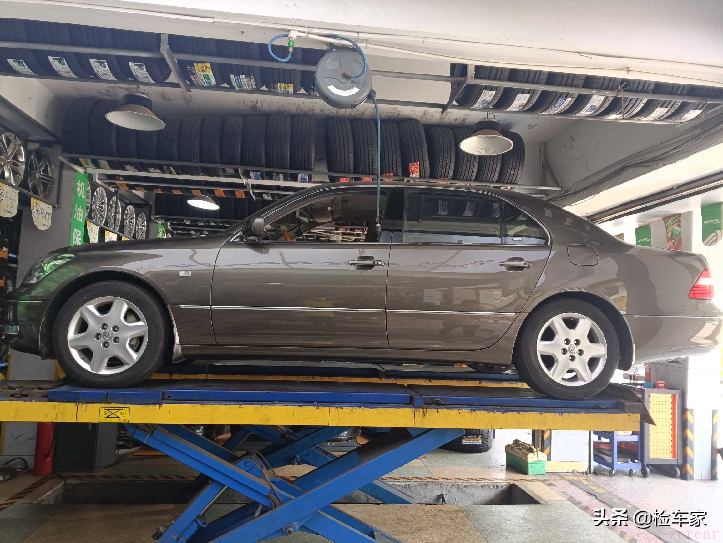 联系车主去上举升机检查底盘,车主没出来,倒是出来一个年轻小伙儿,可能是车主的下属同事吧!他载着二鹏来到了附近的汽修店!路上能体验到这车的乘坐舒服感和静谧性,以及V8发动机的良好工况,一点都不抖啊!