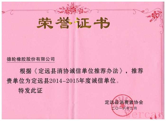 德轮轮胎官网显示,定远县消费者协会根据《定远县消协诚信单位推荐办法》,推荐德轮轮胎为定远县2014-2015年度诚信单位,并于2016年3月向德轮轮胎颁发了荣誉证书。