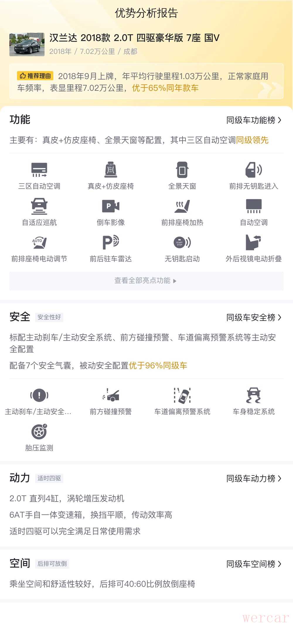 近7年的车,肯定不能用现在的眼光去看待,所以实用为主。汉兰达 2018款 2.0T 四驱7座豪华版国VI配备了真皮+仿皮座椅、全景天窗、前排无钥匙进入、定速巡航等配置,其中三区自动空调同级领先。