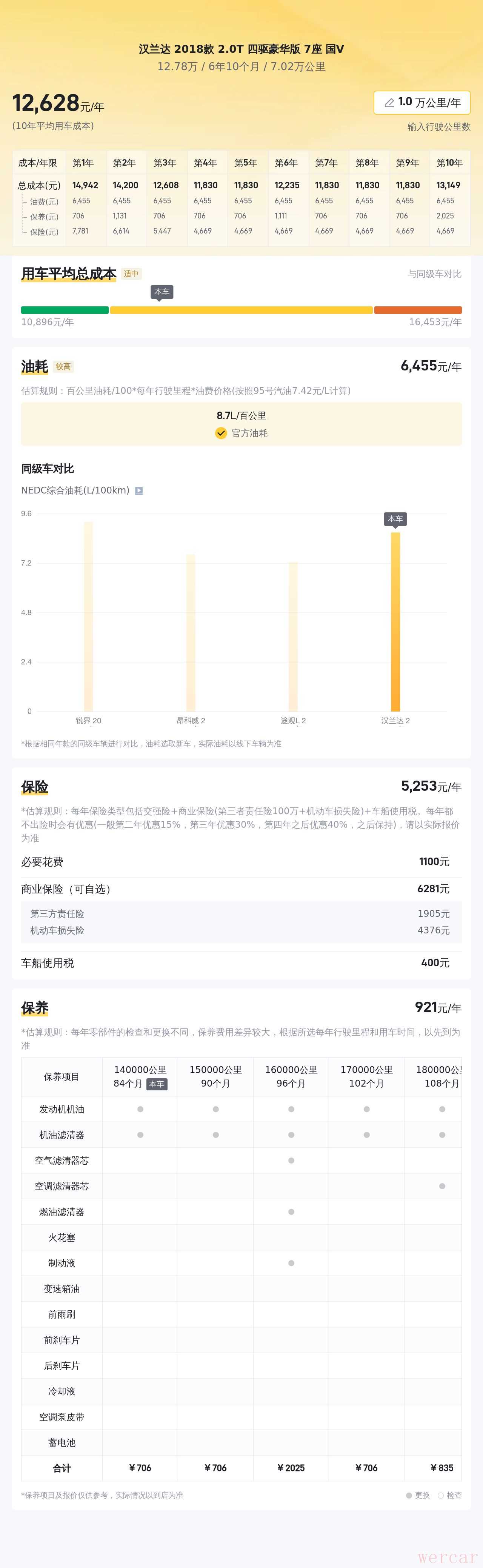 根据估算,同级车的最低用车成本是12706元/年,最高是16640元/年,汉兰达 2018款 2.0T 四驱7座豪华版 国VI是13363元/年,用车成本适中,不过也因人而异。