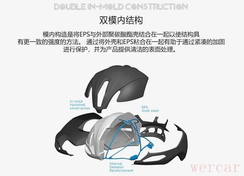 VALECO使用了双模内结构打造,头盔内部的EPS泡沫通过与外部的聚碳酸酯外壳结合在一起从而达到提高强度的效果,为骑行者的头部安全做到最大化的安全保障。