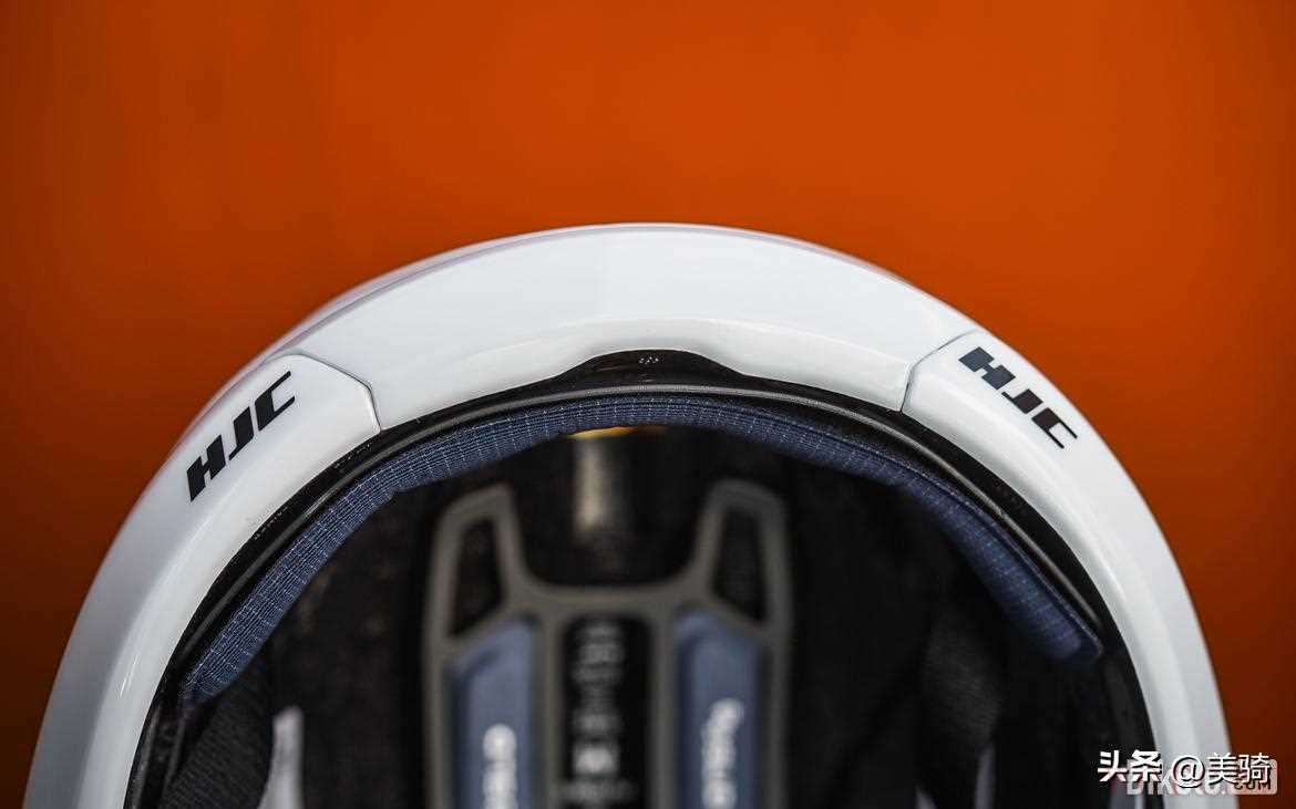 HJC的头盔都比较重视前额保护,所以头盔的前缘都偏厚。为了避免干扰视野,所以头盔前缘添加了一个倒角造型。另外前缘增加了一个小孔,稍微增加一丢丢前额通风效果。