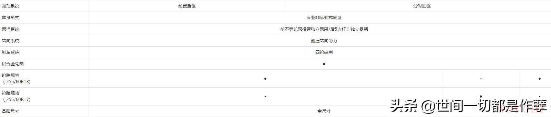 4.它的四驱越野素质还是不错的,非承载车身,有大梁,分时四驱,陡坡缓降,差速锁这些基本越野要求它都有!如果平时家用代步的话,换成两驱就够,而且这样也省油!