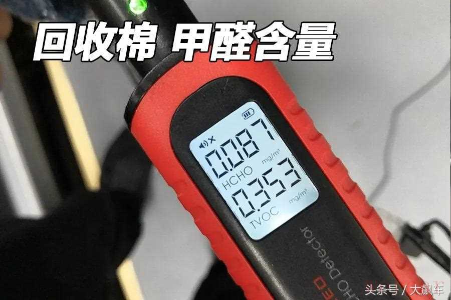 拆掉门板之后,我们可以看到,车门使用塑料板进行密封,每个孔都用胶进行了密封,也就是说这辆车很有可能安装了气压传感器。塑料密封板上有一层回收材料的隔音棉。我们测了一下甲醛含量,为0.087毫克每立方米,属于比较安全的范围。