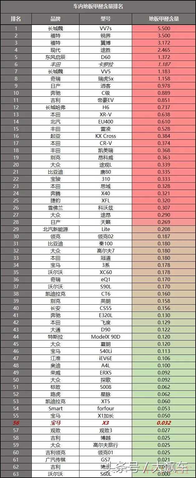 通过测试,这辆车地板中甲醛含量是0.032毫克每立方米,是绿灯安全状态,表示地板内的甲醛含量比较少。