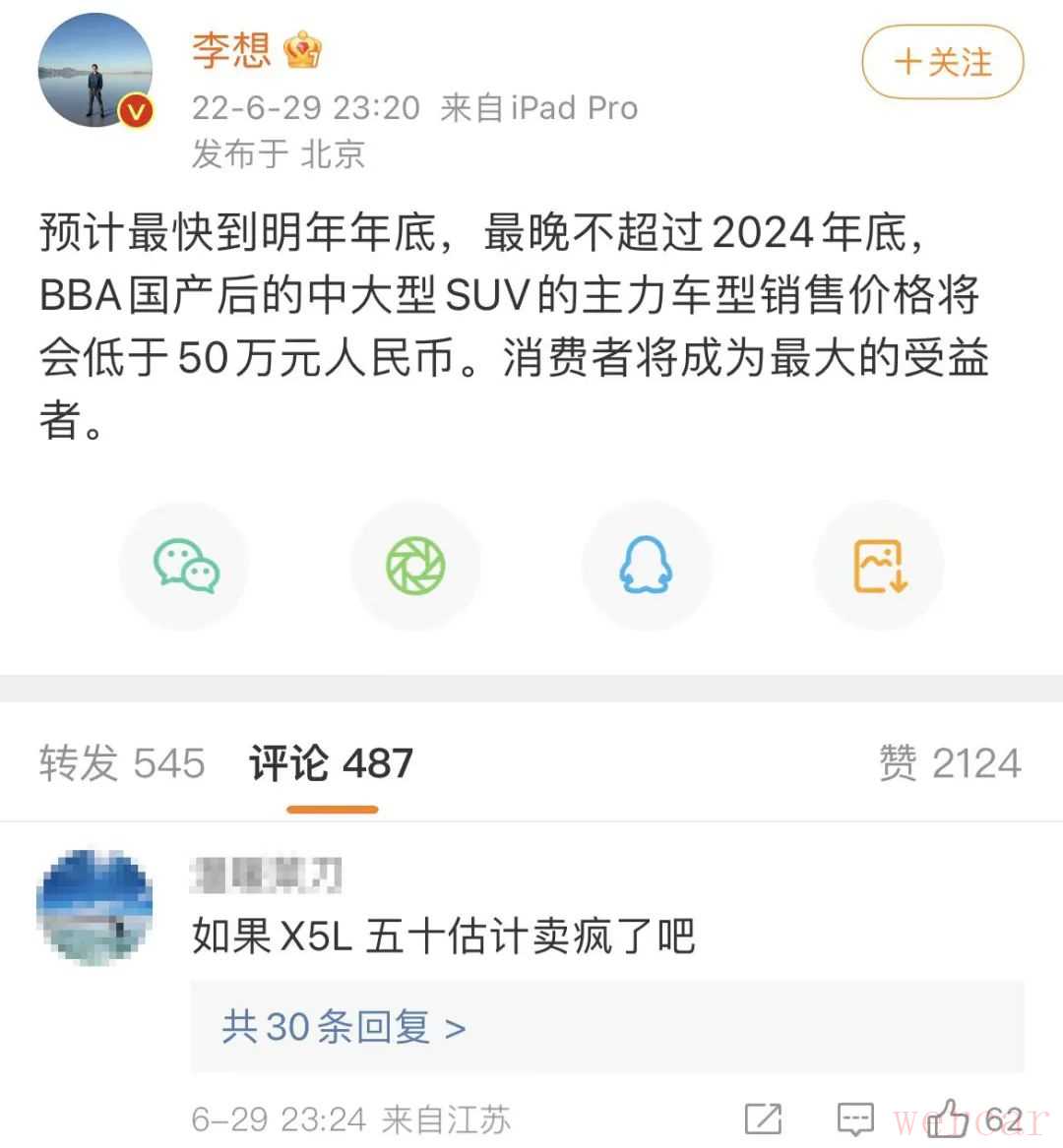最近理想汽车创始人李想在微博上表示,预计2023-2024年间,国产BBA中大型SUV的主力车型销售价将会低于50万元,消费者将会成为最大的受益者。虽然目前我们不知道李想到底是出于什么目的或者已知信息说出此话,但作为一家车企的CEO,李想应该是掌握了一定的行业消息才敢这么说的。