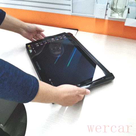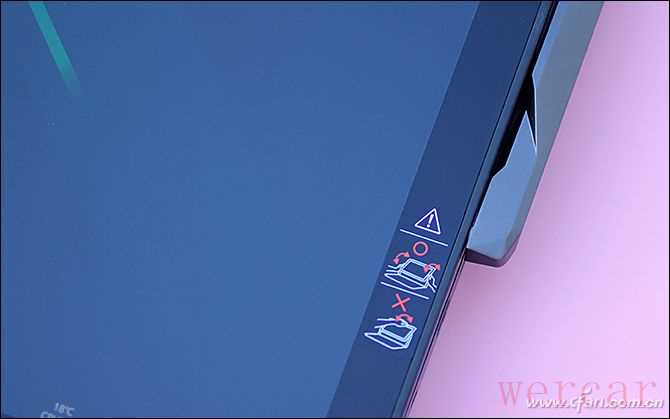 需要注意的是,“行星臂”的特殊结构,在翻转屏幕时需要双手同时沿着屏幕两侧用力,让行星臂两侧的支撑转轴均匀受力。使用一只手很难推动屏幕,而且这种方式也容易导致转轴变形,所以掠夺者刀锋900在屏幕边框上贴有正确操作的提示,大家千万不要迷信“大力出奇迹”。