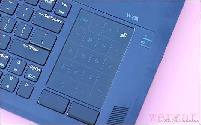 由于键盘下移后没有安置触控盘的空间,所以该产品将触控板移到了键盘右侧,通过触控板右上角的触控按钮,还能从触控板切换到数字小键盘模式,在玩单机游戏时再也不必担心没有数字键盘而无法激活修改器的功能了。