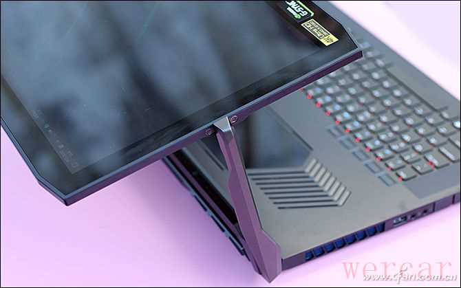 如今市面上的游戏本何止百款,但掠夺者刀锋900绝对是同类产品中最醒目的存在之一,因为在它屏幕的两侧架上了一对特殊设计的“行星臂”,用来替代传统的屏幕转轴。