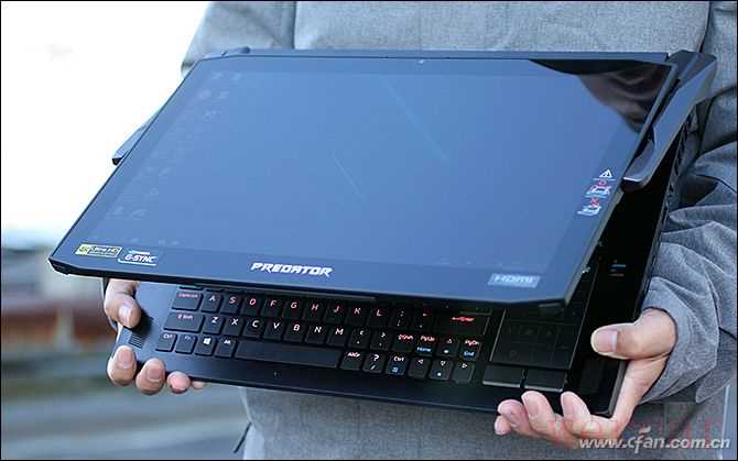 请不要忘记,掠夺者刀锋900可不是搭载低功耗处理器和独显的轻薄本,而是武装时下最高端硬件的顶级游戏本,传统“变形本”的转轴会挡住后面的散热通风口,在平板电脑模式下屏幕也会遮住主机D面的入风口,很难满足高端硬件的散热需求。