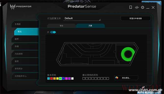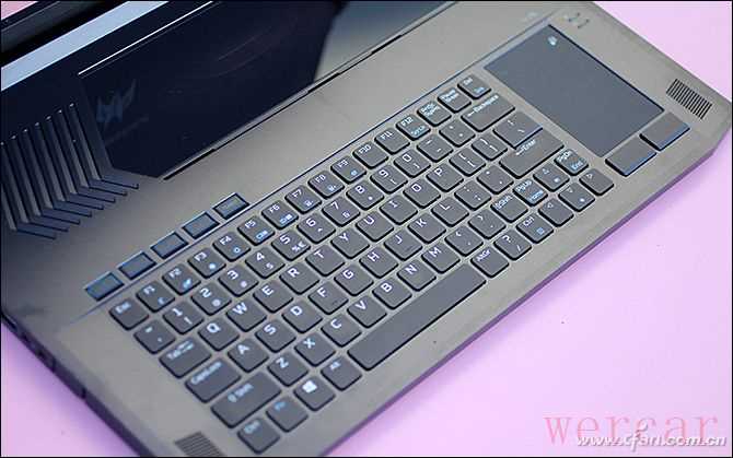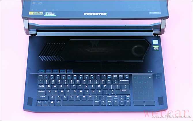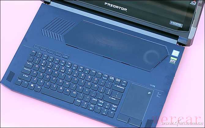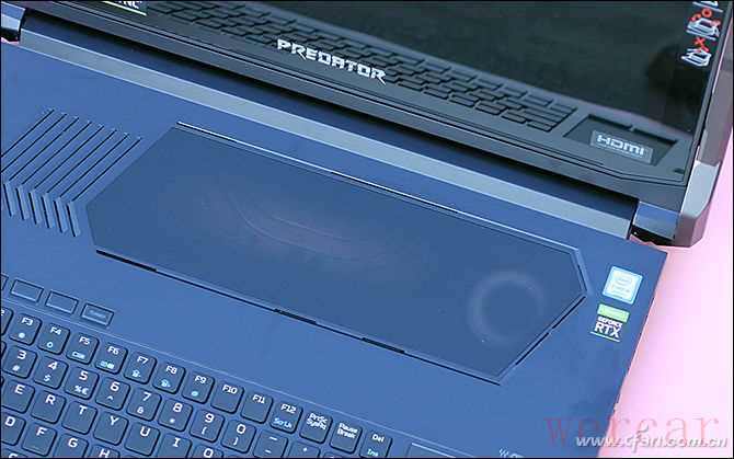 不同于常见的游戏本,掠夺者刀锋900的C面采用了独特的布局,它将键盘下移到了靠近用户的一侧,键盘上方腾出的空间则镶嵌有一块透明的康宁大猩猩玻璃盖板,从中可以看到豪华的散热模块,右侧的风扇内部还藏有呼吸灯(颜色可自定义),开机后通过玻璃可以形成一道炫酷的风景。