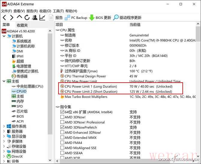 通过Turbo一键加速键或掠夺者控制面板,我们可以轻松对掠夺者刀锋900的处理器进行超频。通过AIDA64可见,i9-9980HK默认的PL1和PL2功耗分别为45W(28m)和107W(2.44ms),激活Turbo模式后PL1和PL2功耗分别提升到了70W(40s)和125W(2.44ms),可以让CPU处于更长时间的“满血”状态。