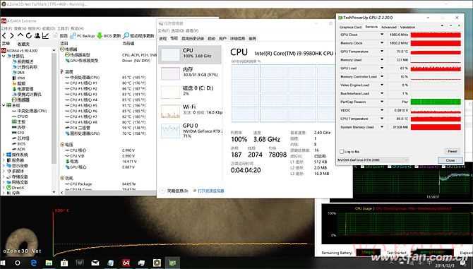 在开启Turbo模式,运行FurMark和AIDA64的双拷机测试中,掠夺者刀锋900的CPU最高主频可以被控制到90摄氏度以内,但CPU的最高主频却可以始终稳定在3.68GHz的水准上。此时,GPU核心频率最高可以超频到接近2000MHz,温度却只有70摄氏度左右。在顶配电竞游戏本中,这个表现已经相当完美了。