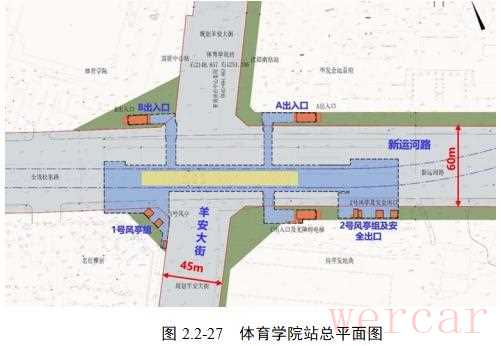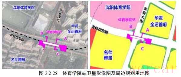 体育学院站是本工程的第13座车站。线路沿金钱松东路—新运河路由东向西走行,车站位于金钱松东路-新运河路与南北向规划路路口处,车站主体沿金钱松东路呈东西向路中敷设。路口周边以居住用地、教育科研用地为主。站位西北侧为沈阳体育学院,站位东北侧为华发全运首府住宅小区,站位东南侧为待开发用地,站位西南侧为名仕雅居住宅小区;站位周边除东南侧待开发用地及规划羊安大街外,已基本实现规划。