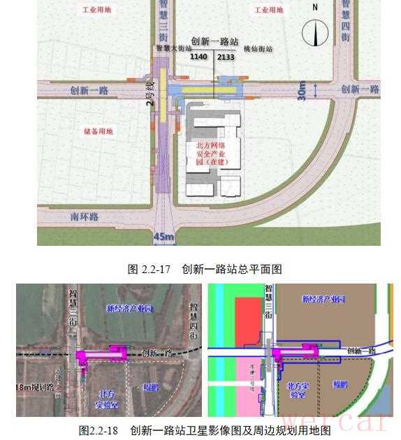 创新一路站为本工程第8座车站,车站位于创新一路与智慧三街交叉口东侧,与在建地铁2号线南延线换乘。车站北侧现状为待开发地块,车站南侧为在建北方网络安全产业园及大面积待开发地块。车站周边规划以工业用地、教育科研用地、商业用地为主,站位周边尚未实现规划。