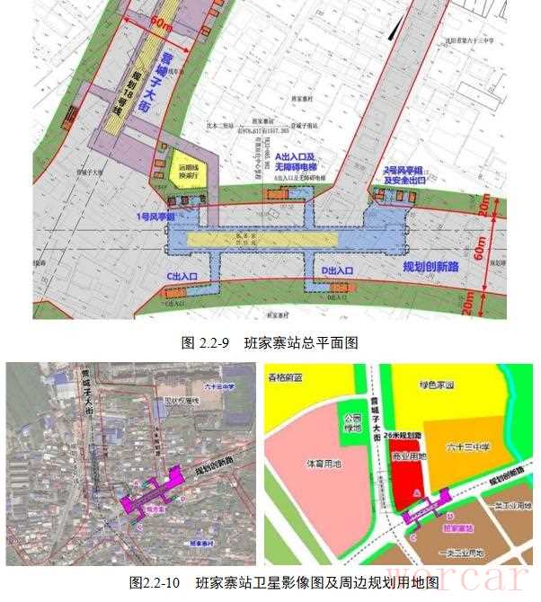 状班家寨村内,与远期地铁18号线换乘。站位北侧为香格蔚蓝、绿色家园小区,东北侧为沈阳市第六十三中学,东侧班家寨村外为耕地。站位周边地块规划性质较为复杂,站位南侧以工业用地为主,站位北侧地块以商业用地、体育用地、教育用地及居住用地为主。