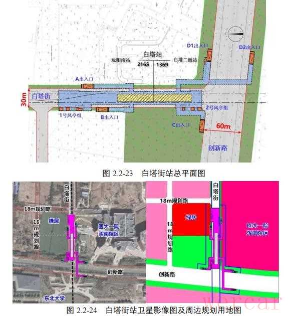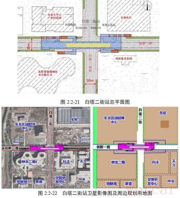 白塔二街站是本工程的第10座车站。车站位于白塔二南街与创新一路交叉口处,沿创新一路东西向敷设。车站站位西侧为东北大学浑南校区,西北侧为东北大学云产业科技园,东北侧为东软医疗院区,西南侧为沈阳聚德视频技术有限公司,东南侧为沈阳蓝光集团。站位周边规划规划以工业用地为主,目前已基本实现规划。