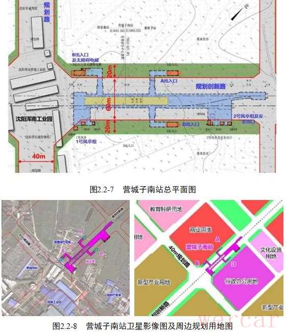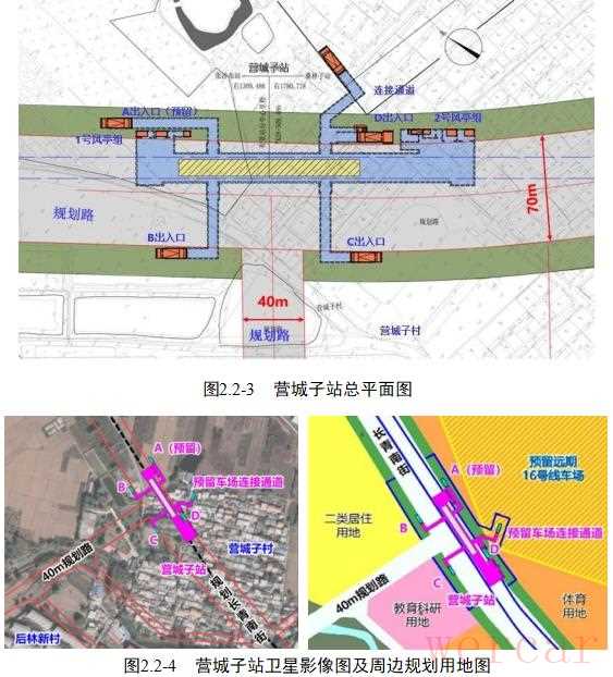 营城子站为本工程起点站,车站位于桑林子车辆段东南侧营城子村内,主体沿规划长青南街跨路口布置。站位所在位置现状为营城子村,站位西侧为后林新村、景悦新村住宅小区,站位东北侧为10号线桑林子车辆段及规划16号线场段用地,500m服务半径内现状以空地及村落为主。站位周边规划以教育科研用地、体育用地、居住用地及轨道交通场段用地为主。