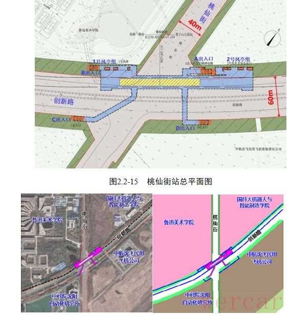 桃仙街站是本工程的第7座车站,车站跨创新路与桃仙街交叉路口设置。站位所处路口东北角现状为在建国科大机器人与智能制造学院,东南角为中航沈飞民用飞机有限责任公司研发大楼及大面积待开发地块,西北角为鲁迅美术学院。车站周边规划以教育科研用地、工业用地为主,尚未完全实现规划。